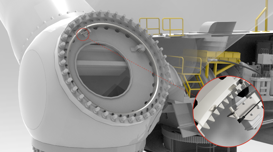 在槳葉自轉(zhuǎn)過程中,LR18XG電感式傳感器通過檢測電動變槳系統(tǒng)中旋轉(zhuǎn)槳葉末端的金屬標記物,判斷槳葉是否旋轉(zhuǎn)至預設(shè)角度。當槳葉到達目標位置時,電感傳感器輸出開關(guān)量信號,確保槳距角在安全范圍內(nèi),從而優(yōu)化風能捕獲效率并避免超載風險。