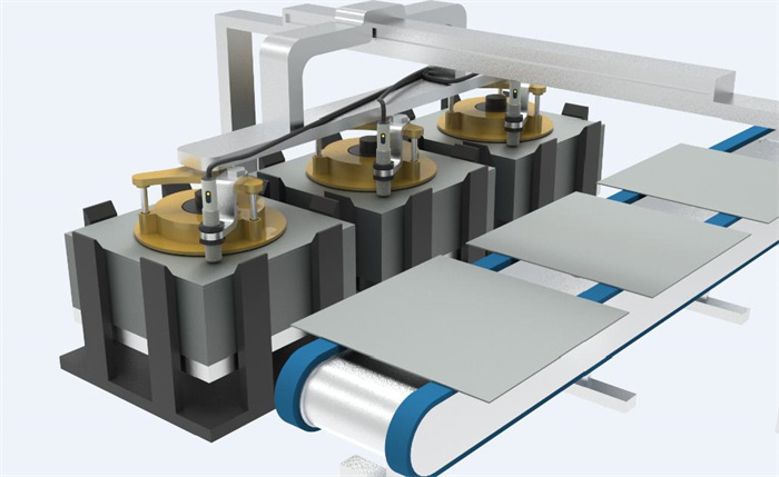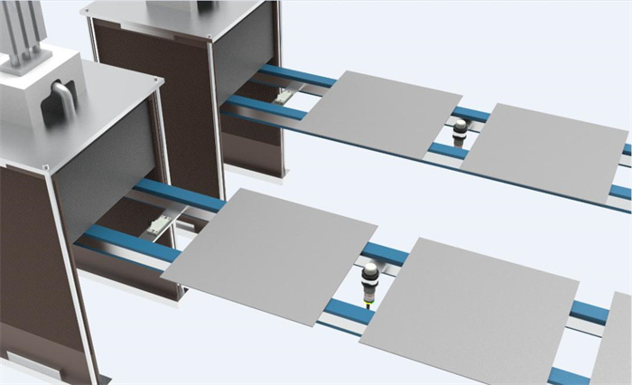 全自動吸片上料機同樣通過吸盤將硅片由堆疊盒放入傳輸軌道,每個軌道內(nèi)安裝蘭寶CE05扁方形電容式系列傳感器識別硅片通過。